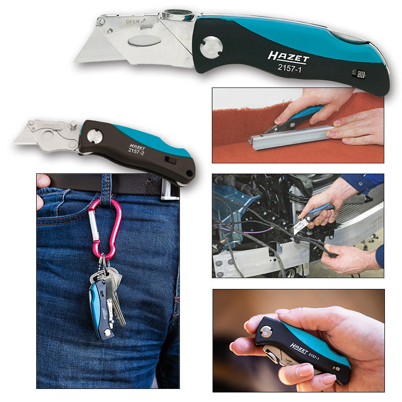 2157-1は、親指クッション付きで関節に負担をかけにくく、ブレードの背に指をのせて力を入れやすい設計。厚手の素材のカットや、しっかり押し切りしたい作業に向きます(展開時159.9mm/折りたたみ時100mm)。替刃交換もクイックで、作業を止めません。