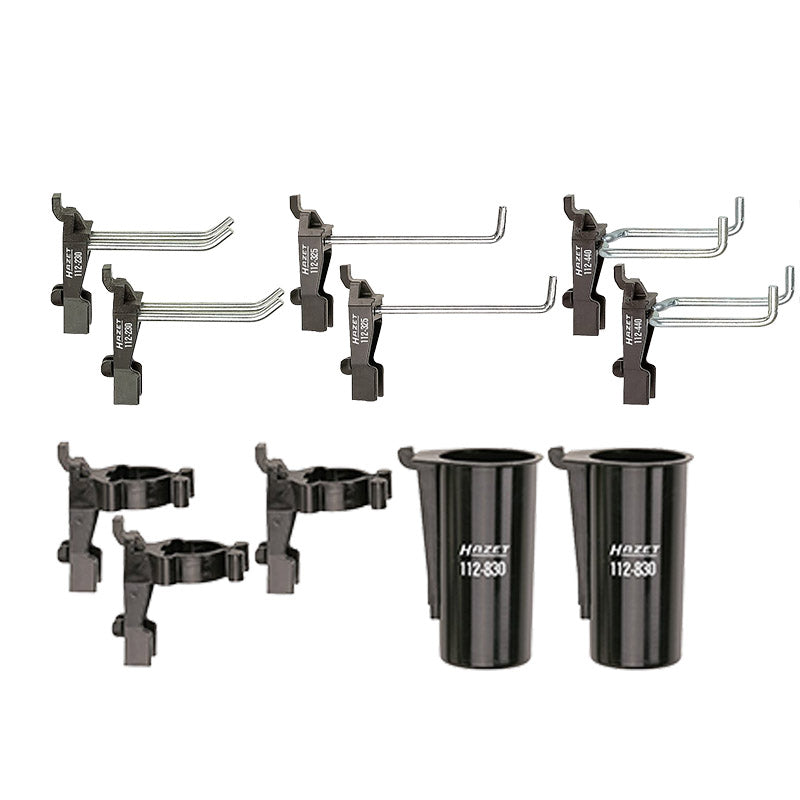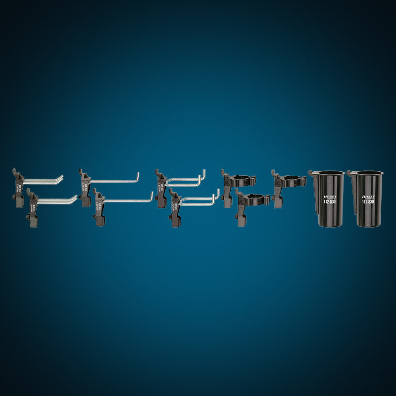 HAZETツールトロリーやワークベンチに取り付け可能なツールホルダーセットです。穴あきパネルに装着して、さまざまな工具をすっきり整理できます。