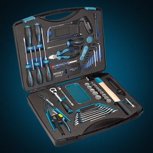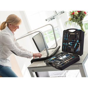 56点の工具を収めたスリムライン仕様のツールセット。高さ105mmとコンパクトながら、多様な作業に対応できる豊富なドライブとプロファイルを備えています。家庭からプロユースまで幅広く活用でき、工具の整理や携帯にも便利です。