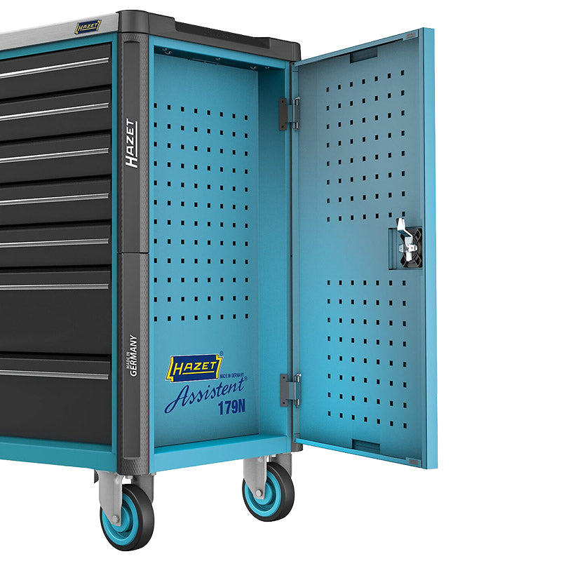 HAZETツールトロリーの側面に取り付け可能なロック付きサイドドア。左右どちらの側面にも対応し、収納部を安全に保護します。