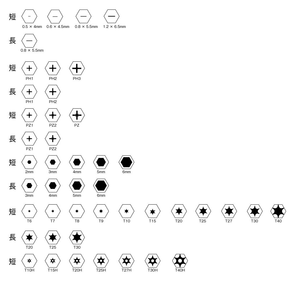 出力 : スロットプロファイル、クロスリセスプロファイルPH、PozidrivプロファイルPZ、内側六角形プロファイル、内側TORX®プロファイル、内側TORX®Plusプロファイル(ピン付き)
